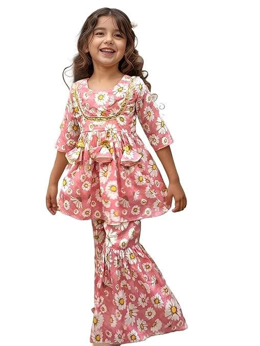 Girls Poly Silk Floral Printed 3/4 Sleeve Sharara Set | Traditional Ethnic Wear Clothing Set for Festival and Special Occasions Size Age 11-12 Year Color Light Pink