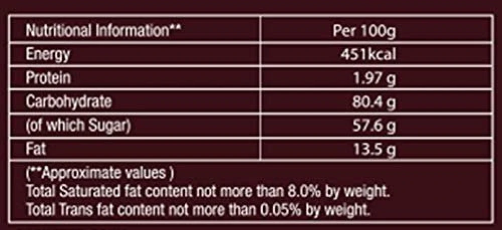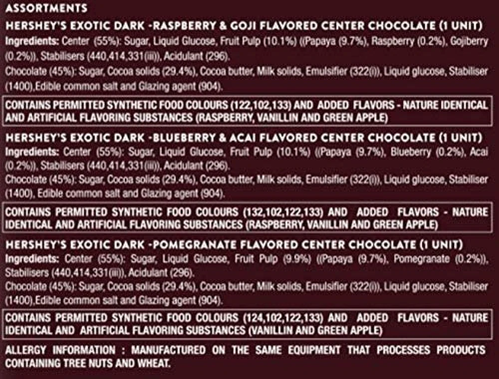 Ingredients : Center (55%): Sugar, Liquid Glucose, Fruit Pulp (10.1%) (Papaya (9.7%), Raspberry (0.2%), Gojiberry( 0.2%)), Stabilisers (440,414,331(iii)), Acidulant (296).Chocolate (45%) : Sugar, Cocoa solids (29.4%), Cocoa butter, Milk solids, Antioxidant (322(i)), Edible common salt,Stabiliser (1400) and Glazing agent (904). / Ingredients : Center (55%): Sugar, Liquid Glucose, Fruit Pulp (10.1%) (Papaya(9.7%), Acai (0.2%), Blueberry(0.2%)), Stabilisers (440,414,331(iii)) and Acidulant (296). Chocolate (45%) : Sugar, Cocoa solids (29.4%), Cocoa butter, Milk solids, Antioxidant (322(i)), Edible common salt, Stabiliser (1400) and Glazing agent (904). / Ingredients : Center (55%): Sugar, Liquid Glucose, Fruit Pulp (9.9%) (Papaya (9.7%), Pomegranate (0.2%)), Stabilisers (440,414,331(iii)) and Acidulant (296). Chocolate (45%) : Sugar, Cocoa solids (29.4%), Cocoa butter, Milk solids, Antioxidant (322(i)), Edible common salt, Stabiliser (1400) and Glazing agent (904)