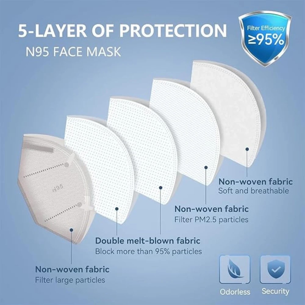 This N95 face mask features a distinctive 3D design that provides ample breathing space while maintaining a secure fit. The multi-layered construction offers enhanced filtration, whilst the adjustable nose bridge ensures a customised seal. The mask's ergonomic shape and elastic ear loops deliver extended wearing comfort throughout the day. Its lightweight, breathable material helps reduce moisture build-up, making it suitable for prolonged use. The structured design helps maintain its shape, preventing the material from collapsing against the mouth. The white colour and professional appearance make it appropriate for various settings. Each mask comes individually wrapped to maintain hygiene during storage and transport. The contoured edges help achieve a proper face seal for different face shapes and sizes.