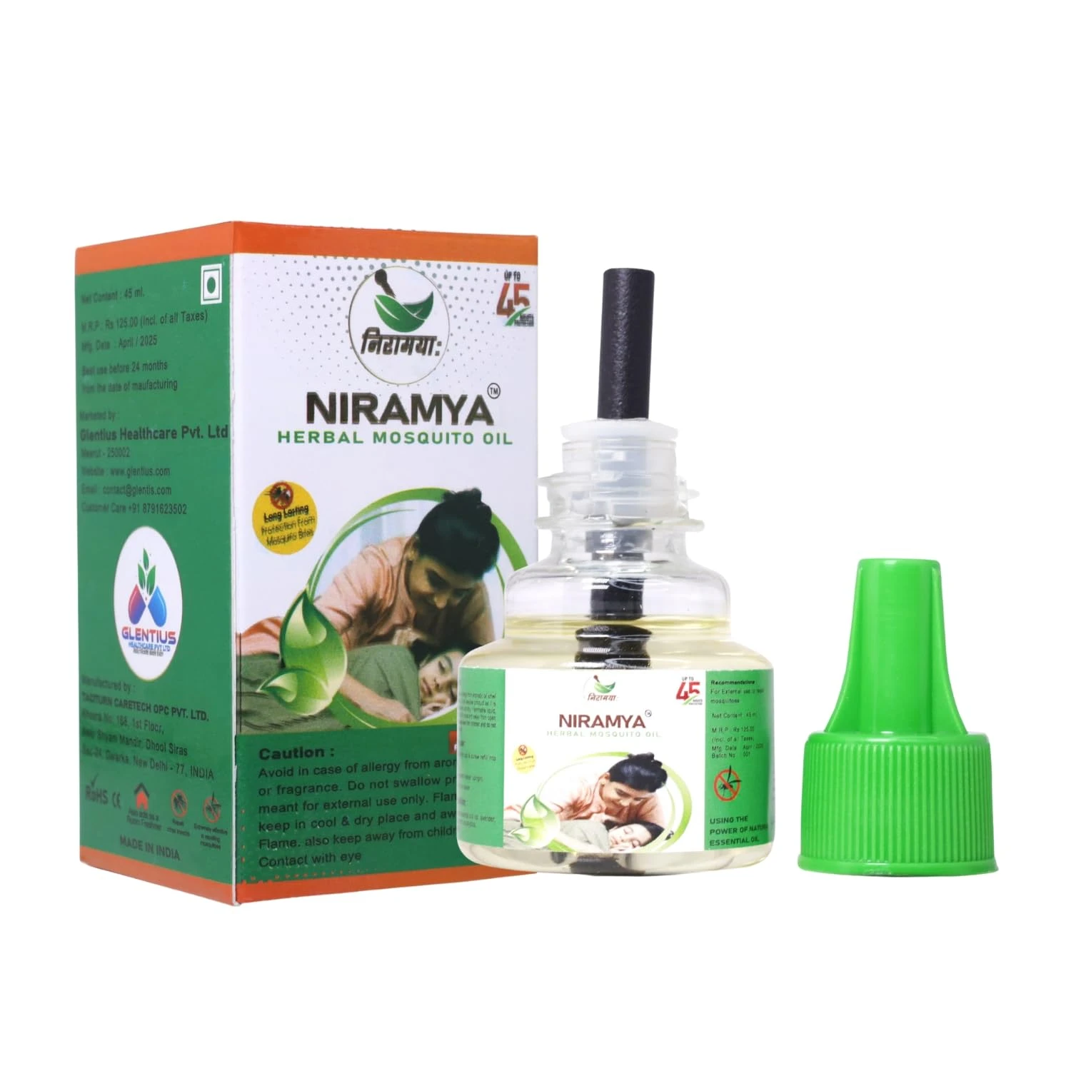 Niramya Herbal Mosquito Vaporizer Refill is your safe, natural defense against mosquitoes. Powered by plant-based ingredients and crafted with care, it offers chemical-free protection that’s gentle on your family but tough on mosquitoes. Unlike conventional repellents, this herbal formula contains no DEET, no synthetic toxins, and no smoke, making it safe for daily indoor use, especially in households with children, pets, or elderly members. It works with all standard electric vaporizer machines and provides long-lasting effectiveness, helping you enjoy peaceful, mosquito-free nights—naturally and safely.