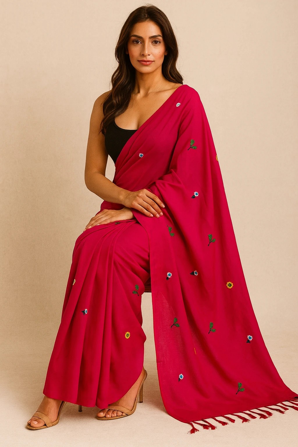 SAREEN Handcrafted Pure Khadi Cotton Saree, Multicolor Hand-Embroidered Floral Motifs, Traditional Style with Tassels (Rani Pink)