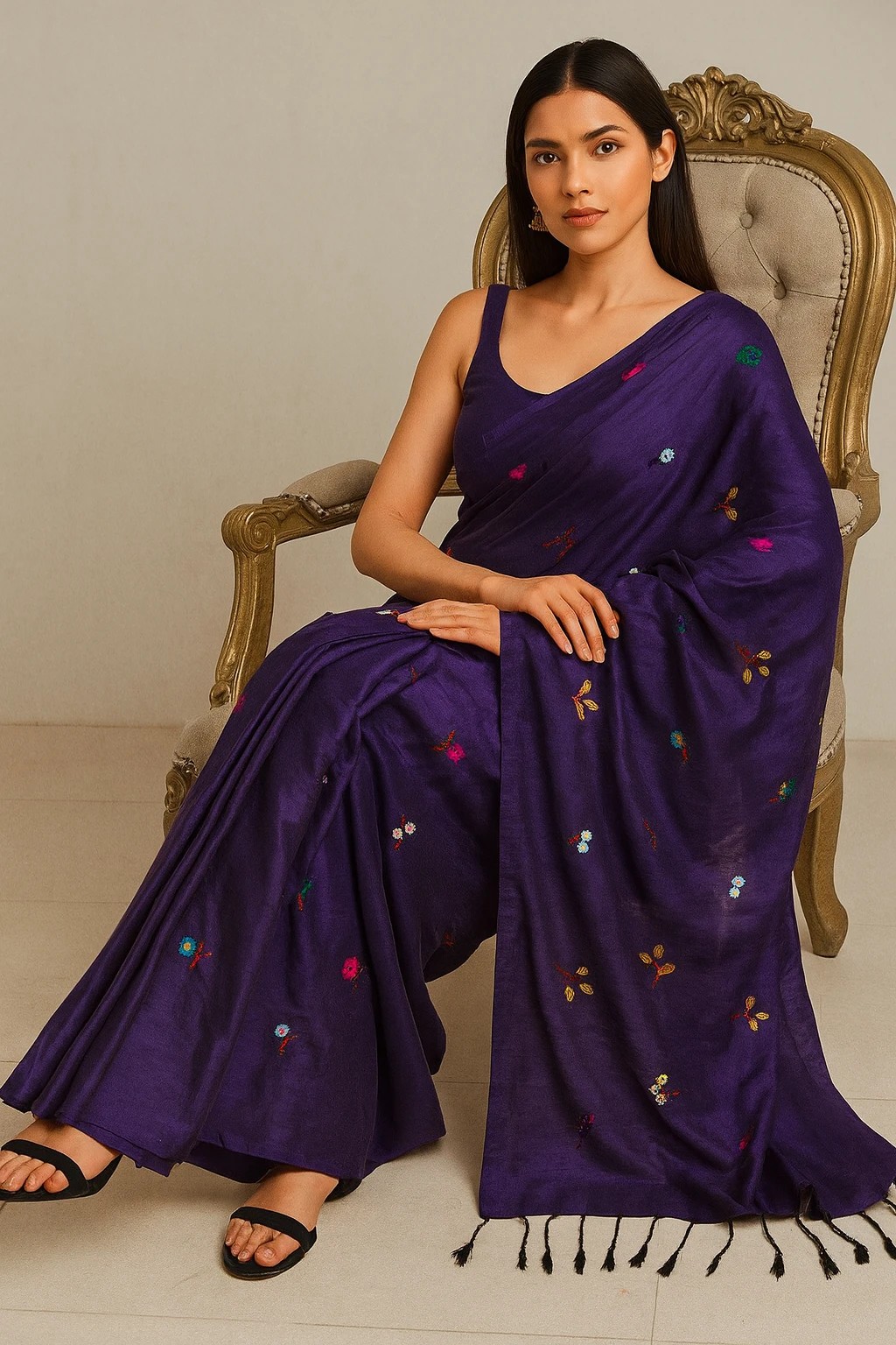 SAREEN Handcrafted Pure Khadi Cotton Saree, Multicolor Hand-Embroidered Floral Motifs, Traditional Style with Tassels (Royal Purple)