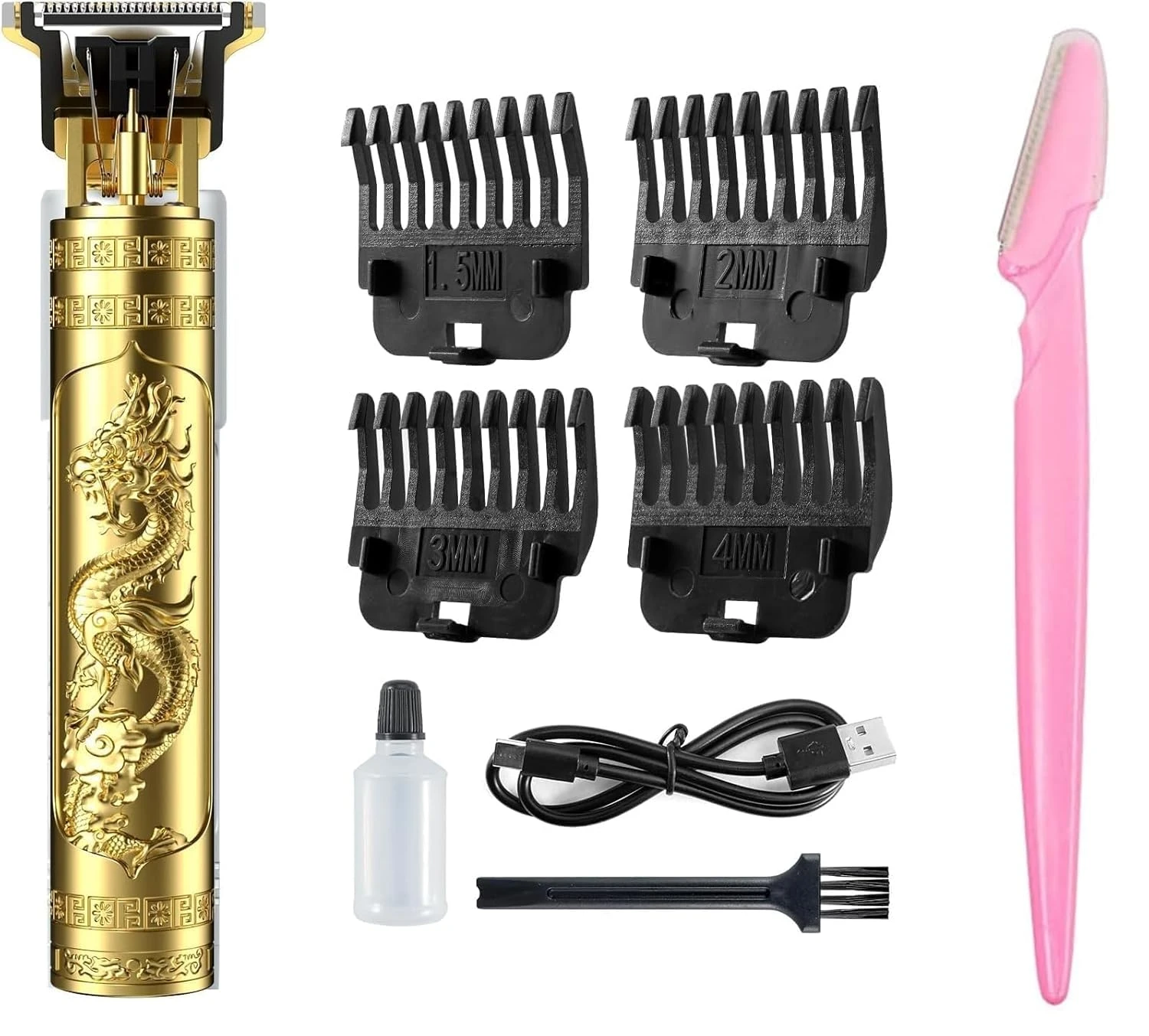 Trimmer Men Professional Cordless Hair Clipper Dragon And Buddha Style, Rechargeable Trimmer For Beard, Hairs, Moustache & Face, Electric T Blade Zero Gapped Shaving Machine With Women Reusable Face Razor (Gold)
