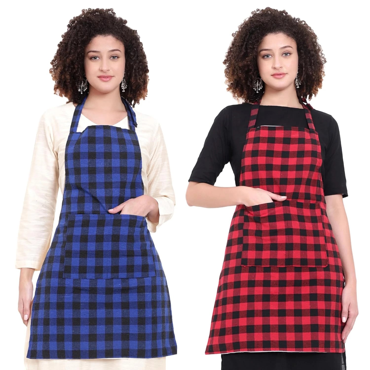 Waterproof Unisex Kitchen Checkered Design Apron with 2 Front Centre Pocket With Adjustable Neck Strap Color Blue/Red (Pack Of 2)