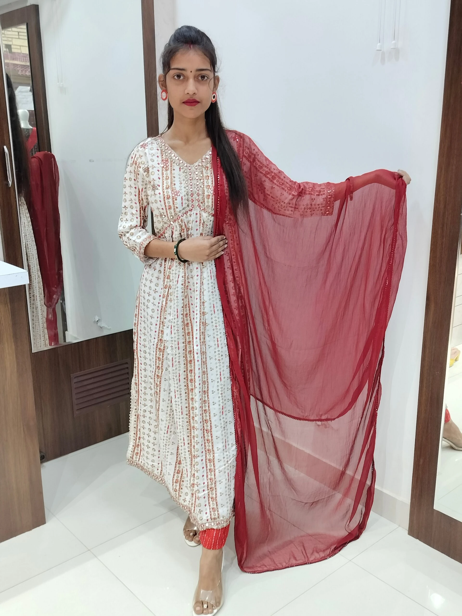 Women's Aliya with anarkali pattern Embroidered Kurta with Pant and Dupatta Set Size Medium Color White